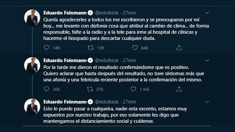 “Quería agradecerles a todos los que me escribieron y se preocuparon por mí. Hoy me levanté con disfonía, cosa que atribuí al cambio de clima…De forma responsable, falté a la radio y a la tele para irme al Hospital de Clínicas y hacerme el hisopado para descartar cualquier duda”, comenzó diciendo Feinmann.