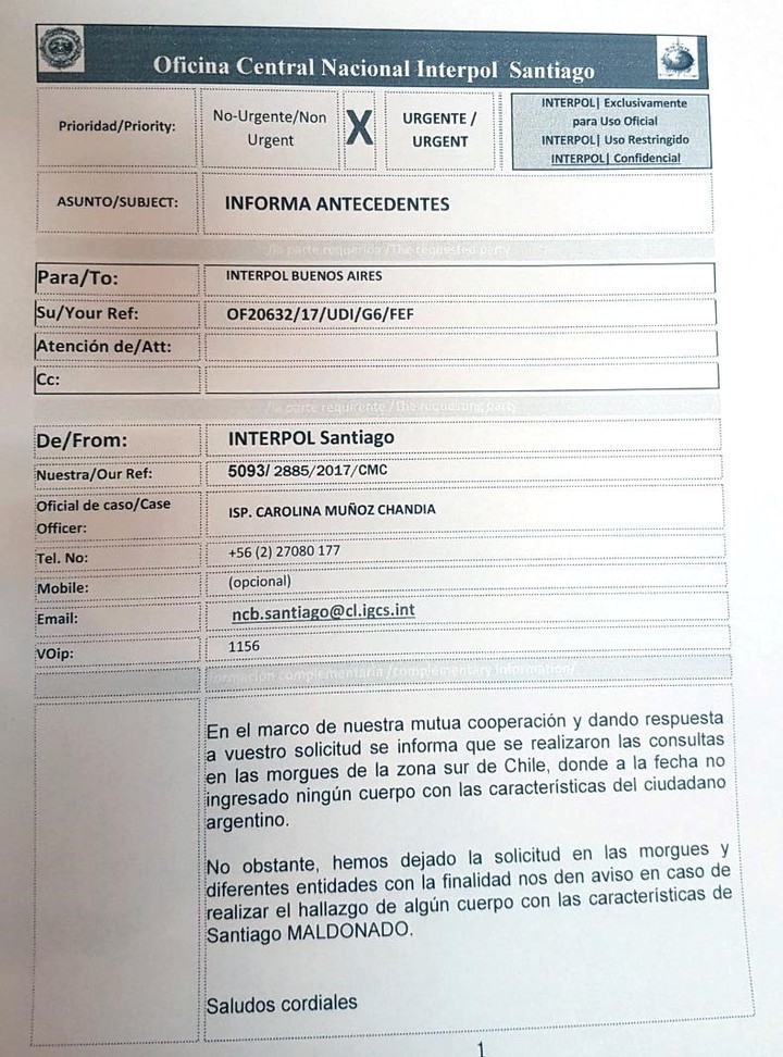"No ha ingresado ningún cuerpo con las características del ciudadano argentino". La negativa pertenece a la Oficina Central Nacional de Interpol en Chile y fue enviada esta mañana a la sede de Interpol de Argentina, ante la consulta y distintas versiones que comenzaron a circular anoche respecto a la posibilidad de que Santiago Maldonado había aparecido sin vida en Chile.