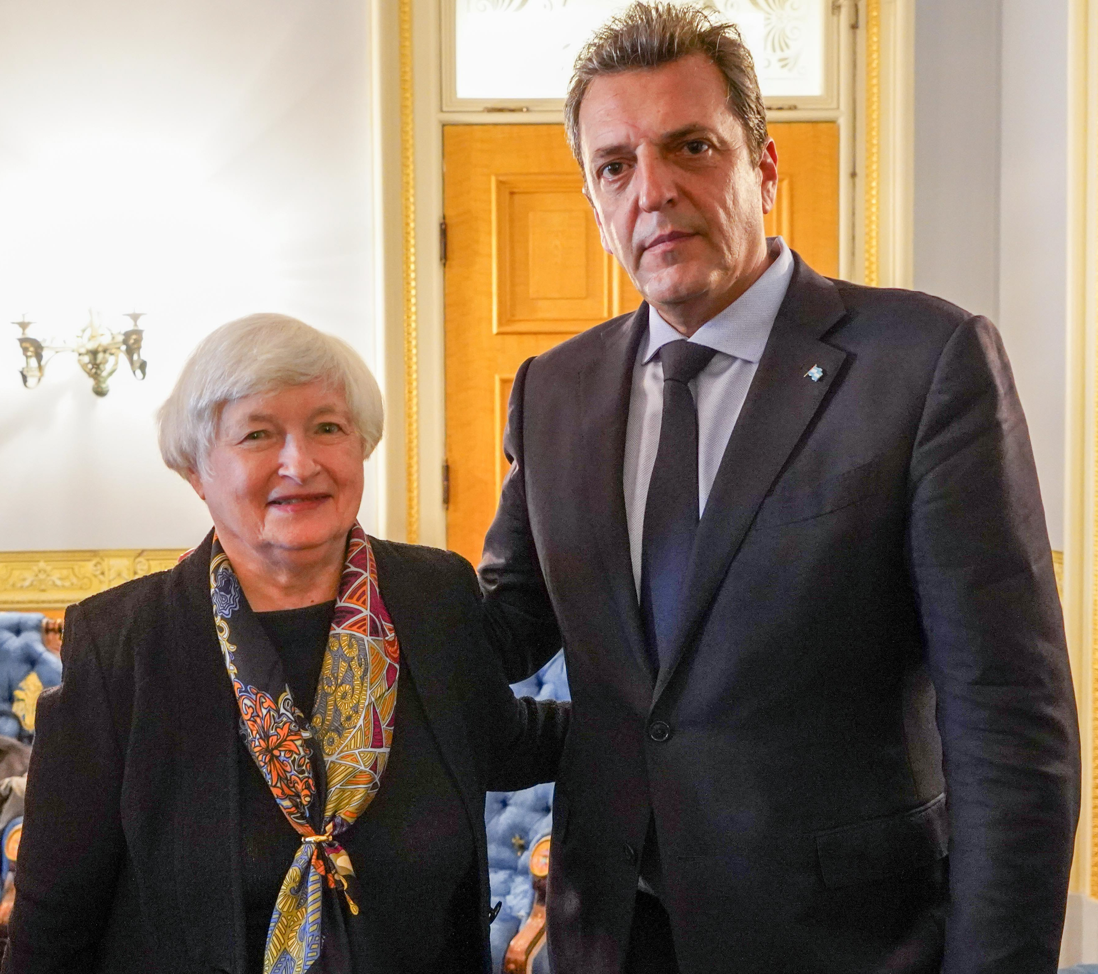 La secretaria del Tesoro de EEUU, Janet Yellen, recibió al Ministro de Economía, Sergio Massa, en la sede del Tesoro, al lado de la Casa Blanca, mantuvo una breve charla, se sacó dos fotos y le pidió ‘implementar las reformas necesarias para reconstruir la credibilidad, estabilizar los mercados y sentar las bases para un crecimiento sostenible".