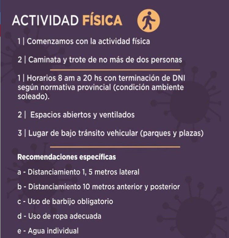Además se detallaron recomendaciones específicas para poder realizar la actividad física: mantener el distanciamiento de un metro y medio lateral, y de 10 metros anterior y posterior; uso de ropa adecuada; uso individual de botellas de agua; y “no poseer contraindicaciones contra la práctica deportiva”. Tanto para realizar caminatas como trotes en parques y plazas, rige el uso obligatorio de barbijo.