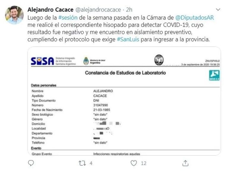 "Es falso que el bloque no se quiere hisopar, todos estos que están abajo diputados y empleados ya se hisoparon y el resto lo va a ir haciendo. Todos los de abajo negativos", emitieron en un comunicado con un punteo de cada uno que fue testeado.