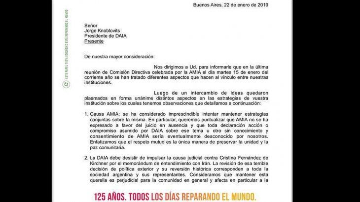 La nueva postura se adoptó en la última reunión de Consejo Directivo del martes 15 de enero pasado y la notificación a la DAIA fue fechada el 22. La carta fue firmada el vicepresidente 1° de la AMIA, Ariel Eichbaum, y el secretario general de la entidad, Darío Fernan Curiel.