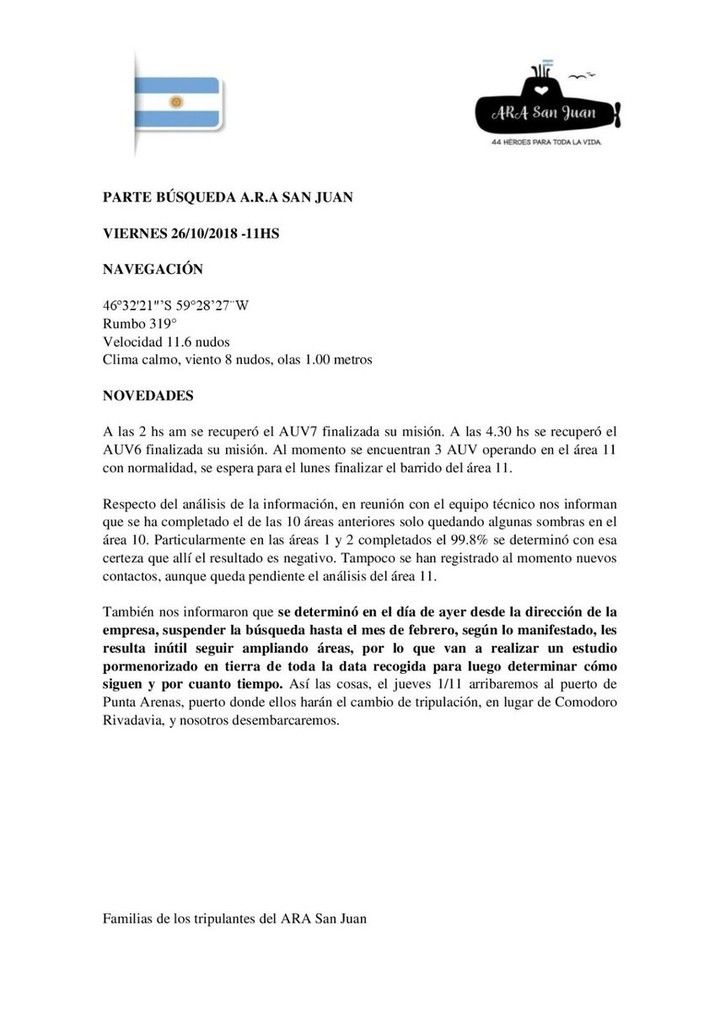 "Nos informaron que se determinó en el día de ayer desde la dirección de la empresa, suspender la búsqueda hasta el mes de febrero, según lo manifestado, les resulta inútil seguir ampliando áreas, por lo que van a realizar un estudio pormenorizado en tierra de toda la data recogida para luego determinar cómo siguen y por cuánto tiempo", informaron los familiares hoy por la mañana.