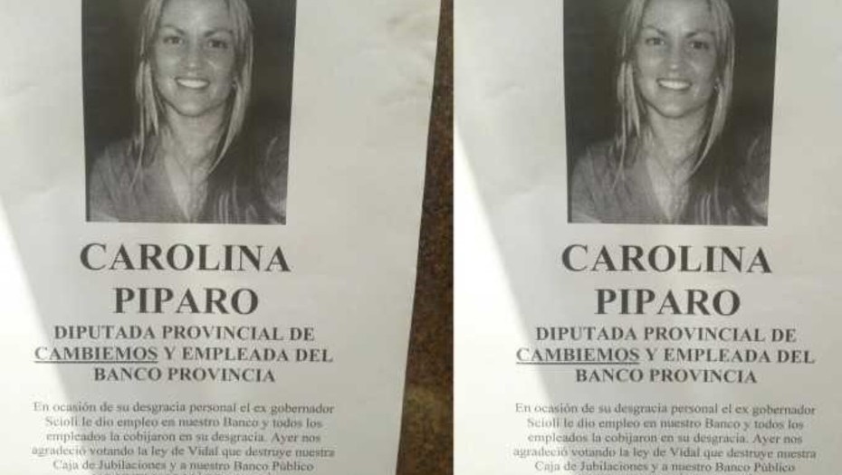 ¿Cuál es la relación de Píparo con la actividad del banco? Dejemos que los carteles expliquen: “En ocasión de su desgracia personal el ex gobernador (Daniel) Scioli le dio empleo en el Provincia y todos los empleados la cobijaron en su desgracia. Ayer nos agradeció votando la ley de Vidal que destruye nuestra Caja de Jubilaciones y a nuestro Banco Público”, menciona la folletería.
