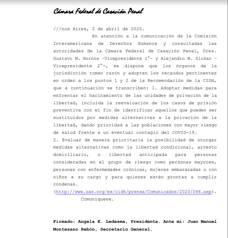 La decisión fue firmada por la presidenta de la Cámara de Casación Angela Ledesma en consulta con los jueces Gustavo Hornos y Alejandro Slokar y “en atención a la comunicación de la Comisión Interamericana de Derechos Humanos”. Así se apoyaron en uno de los argumentos de ese organismo e instaron a sus pares a “adoptar medidas para enfrentar el hacinamiento de las unidades de privación de la libertad, incluida la reevaluación de los casos de prisión preventiva con el fin de identificar aquellos que pueden ser sustituidos por medidas alternativas a la privación de la libertad, dando prioridad a las poblaciones con mayor riesgo de salud frente a un eventual contagio del COVID-19”.