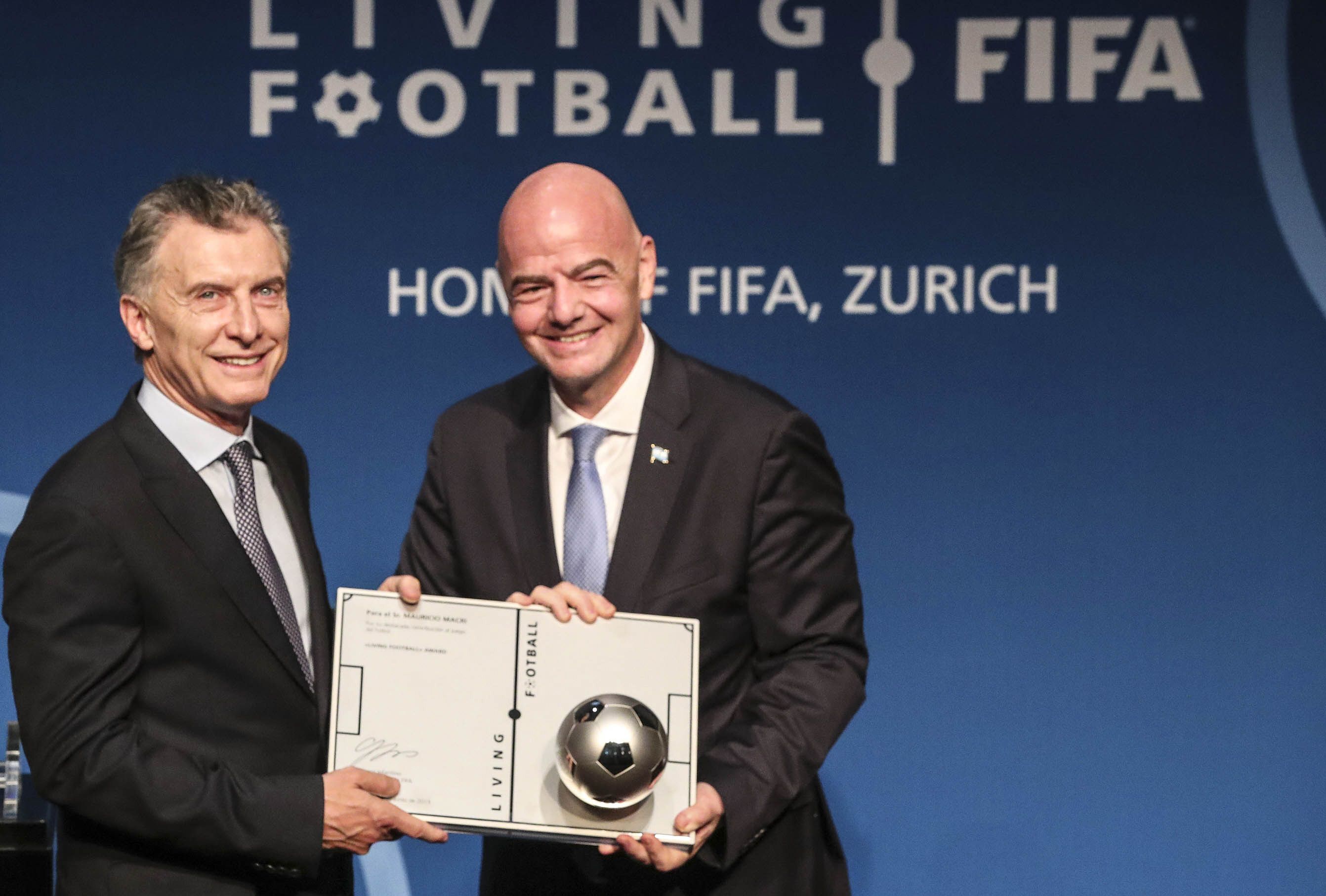 El presidente Mauricio Macri recibió ayer en Zurich, Suiza, la primera edición del premio Living Football Award, reconocimiento de la FIFA a personalidades del mundo por su liderazgo en el desarrollo del fútbol y el sostenimiento de los valores del deporte como vehículo para el crecimiento de las sociedades.