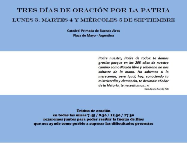 Ante la crisis económica, la Iglesia llamó a “dedicar tres días de oración por la Patria”. La convocatoria partió desde la Catedral de Buenos Aires ante “las actuales circunstancias sociopolíticas y económicas” que atraviesa el país.