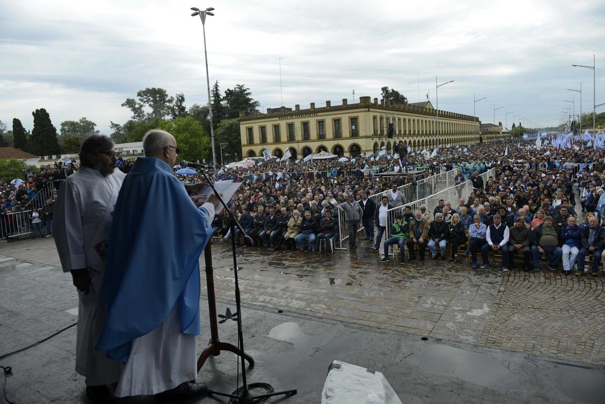 La convocatoria a la misa, que se realizó al mediodía, también fue hecha por Sergio Palazzo (Bancarios) y Ricardo Pignanelli (SMATA) convocaron a la misa. Fue presidida desde un altar levantado en la vereda de la basílica por el arzobispo de Mercedes – Luján, Agustín Radrizzani. "Quiero felicitarlos que construyan una alternativa humana a la globalización excluyente. Que Dios les dé coraje, perseverancia y pasión para seguir sembrando", sostuvo el arzobispo. Y agregó: "Existe un sistema de avaricia, el sistema financiero es su máxima expresión".
