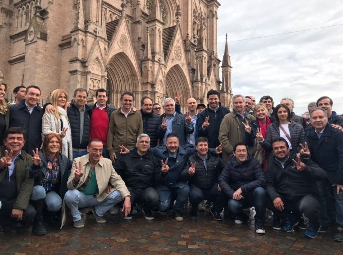 Intendentes, dirigentes y políticos, en una foto de familia antes de la misa en Luján, convocada por Hugo Moyano.