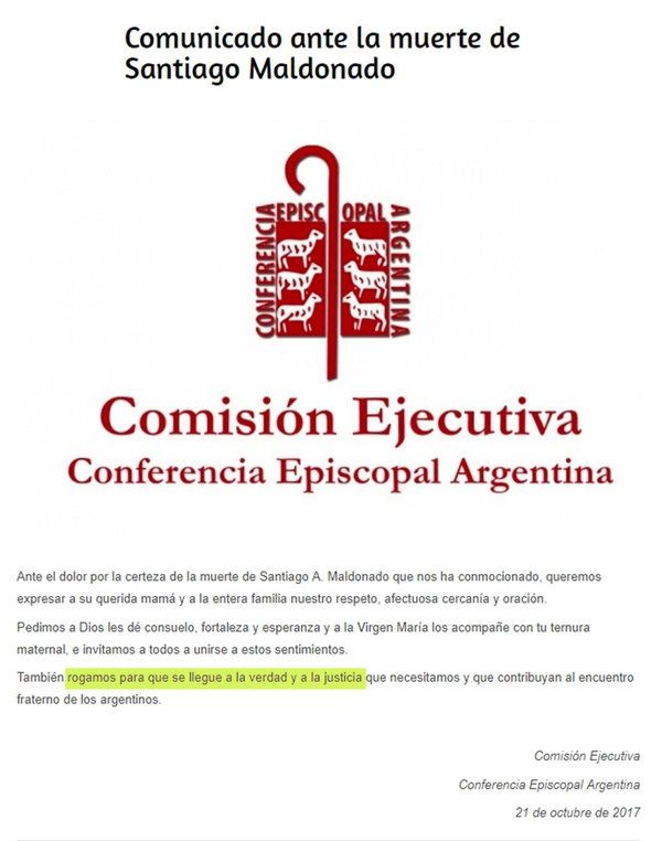 La comisión ejecutiva de la Conferencia Episcopal Argentina difundió un comunicado luego de que la familia y la justicia confirmaran que el cuerpo hallado el martes en el río Chubut era el de Santiago Maldonado.