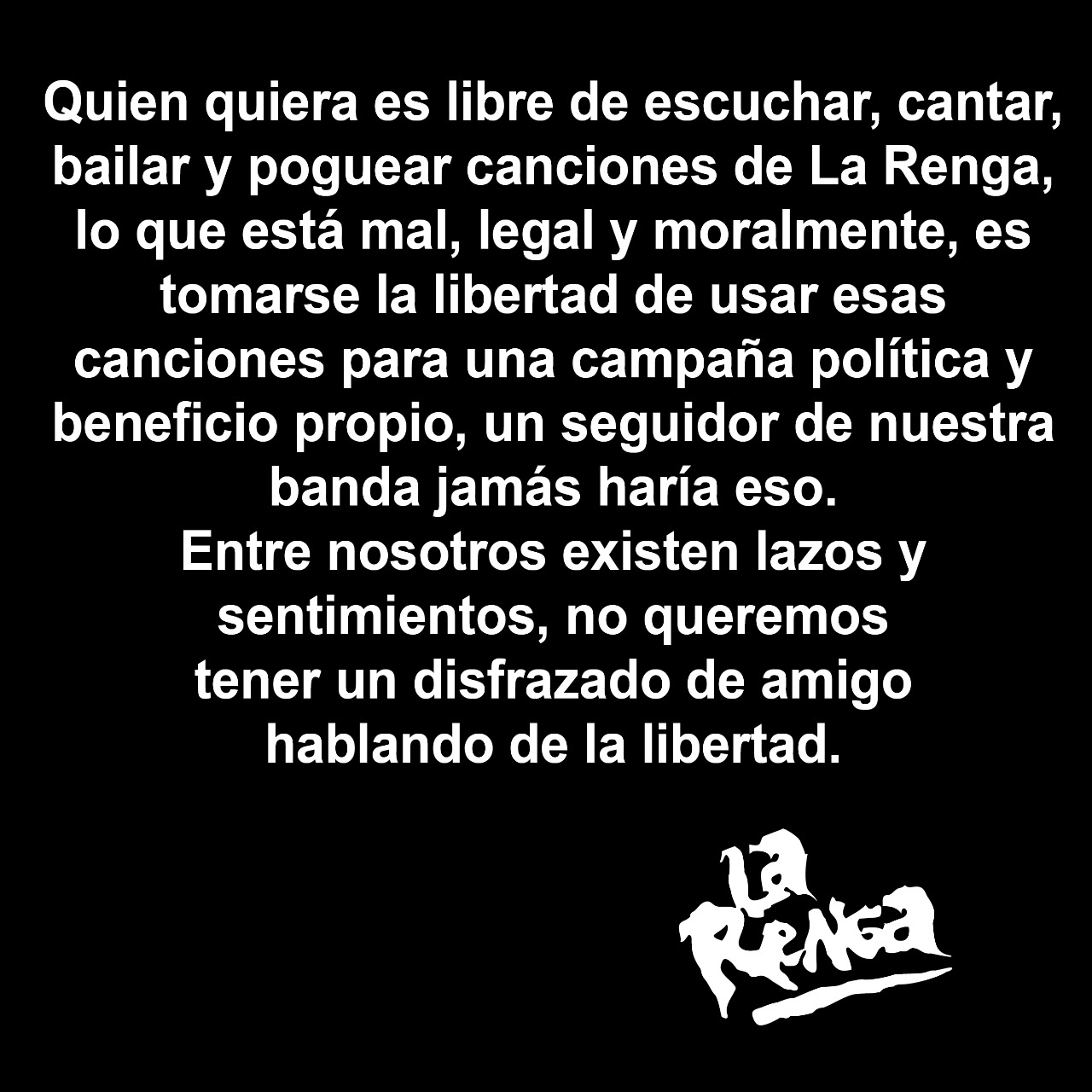 “Quien quiera es libre de escuchar, cantar, bailar y poguear canciones de La Renga, lo que está mal, legal y moralmente, es tomarse la libertad de usar esas canciones para una campaña política y beneficio propio, un seguidor de nuestra banda jamás haría eso”, publicó en Twitter.