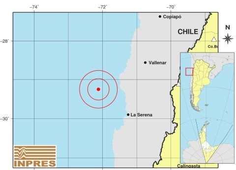 El epicentro se ubicó a 428 kilómetros al noroeste de la Ciudad de San Juan, a 509 kilómetros al noroeste de la Ciudad de Mendoza y a 108 kilómetros al noroeste de Coquimbo.