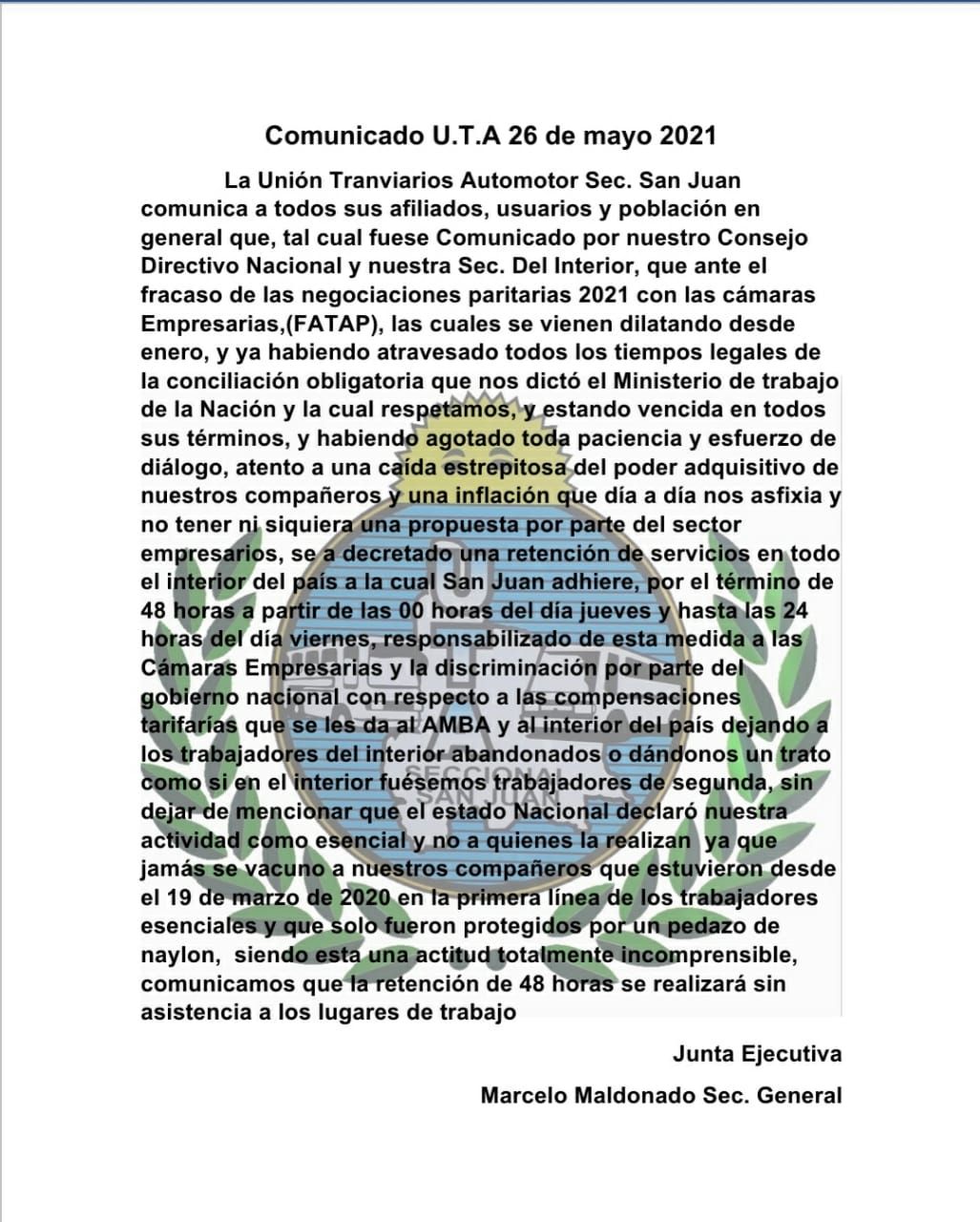 La Secretaria del Interior del Consejo Directivo Nacional de la Unión Tranviarios Automotor informó que "se ha resuelto un cese de actividades en todas las Seccionales del Interior del País, Córdoba, Comodoro Rivadavia, Tierra del Fuego, Río Gallegos, Tucumán, Mar del Plata, Salta, Santa Fe, Entre Ríos, Neuquén, Jujuy, Catamarca y La Rioja, Rosario, La Pampa, Formosa, San Luis, Corrientes, San Juan, Bariloche, Bahía Blanca, Chaco, Río Negro, Santiago del Estero, San Nicolás de los Arroyos y Trelew por 48 horas, sin concurrencia a los lugares de trabajo, a partir de las 00 horas del día 27 de mayo del corriente.