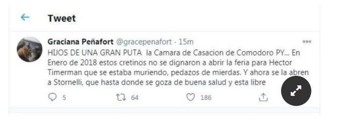 “HIJOS DE UNA GRAN PUTA la Cámara de Casación de Comodoro Py….En Enero de 2018 estos cretinos no se dignaron a abrir la feria para Hector Timerman que se estaba muriendo, pedazos de mierdas. Y ahora se la abren a Stornelli, que hasta donde se goza de buena salud y está libre”, afirmó la polémica asesora jurídica en su perfil de Twitter.