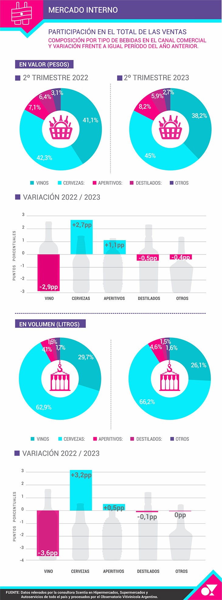 Dentro de la categoría Vino, relevados por Scentia, se incorporan y suman todas las variantes y opciones, desde espumantes a vinos en caja o multilaminado, latas, embotellados y varietales, fortificados y gasificados.