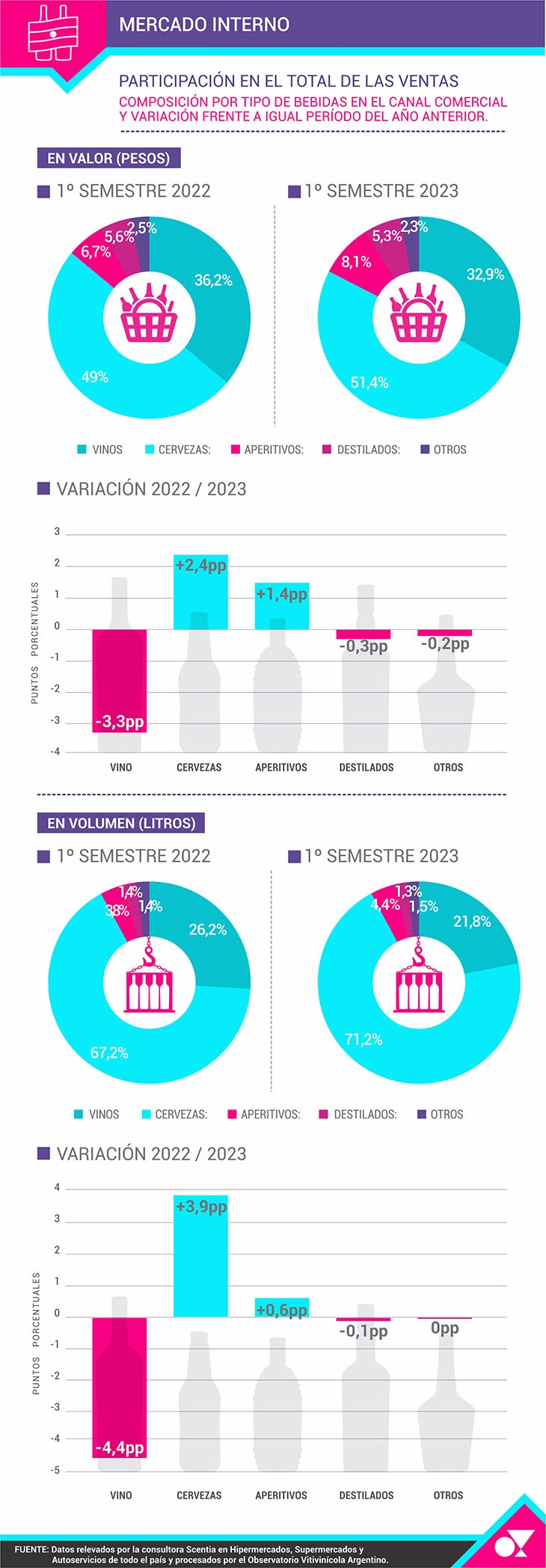 En el primer semestre de 2023, comparado con igual período de 2022 y siempre sobre la base del relevamiento de Scentia en el canal tradicional, el Vino (sumando todos los envases y espumantes) cae 3,3 puntos porcentuales en la participación de ventas totales en facturación de Bebidas con Alcohol al pasar del 36,2% en 2022 al 32,9% de 2023.