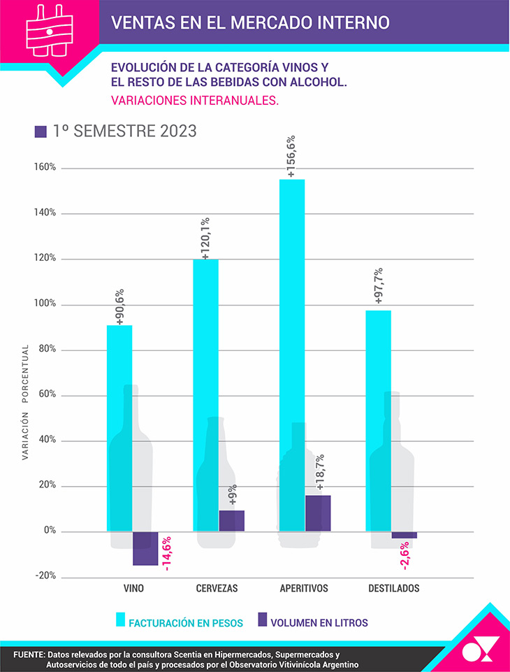 En el acumulado al primer semestre del 2023 contra igual período de 2022, la categoría Vino es la que menos creció en facturación, con un +90,6%, y la que sufre la mayor caída en volumen con el -14,6%.