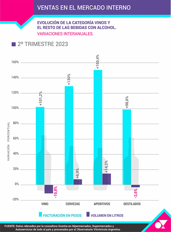 La categoría Vino y la de Destilados son las únicas dos que registran caídas en sus ventas en volumen (-10,8% y -2,6%) y son las que menos crecieron en facturación (+101,2% y +98,6%). La categoría Cervezas creció en el segundo trimestre del 2023 un 130% en facturación y 6,9% en el volumen de venta; mientras que Aperitivos subió 150,4% en pesos y aumentó 14,2% en litros totales vendidos, según relevamiento de Scentia.