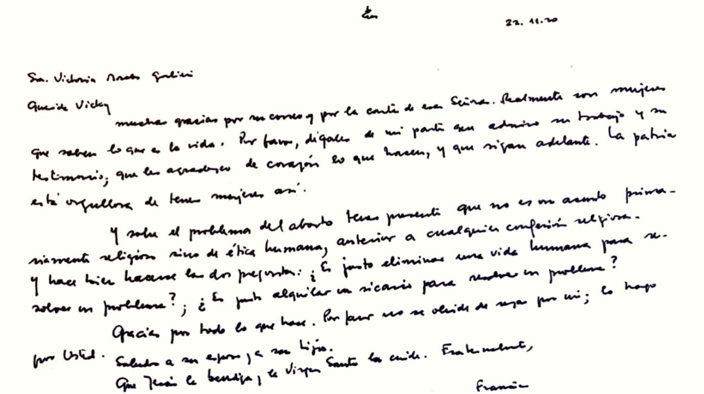 En la carta, que tiene fecha el 22 de noviembre, Francisco manifestó que “el problema del aborto debe tener presente que no es un asunto primariamente religioso sino de ética humana, anterior a cualquier confesión religiosa”.