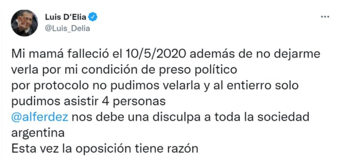 El piquetero Luis D’Elía también fustigó desde Twitter al Presidente por la fiesta de cumpleaños en la Quinta de Olivos: “Mi mamá falleció el 10/5/2020 y además de no dejarme verla por mi condición de preso político, por protocolo no pudimos velarla y al entierro solo pudimos asistir 4 personas. Alberto Fernández nos debe una disculpa a toda la sociedad argentina. Esta vez la oposición tiene razón”.