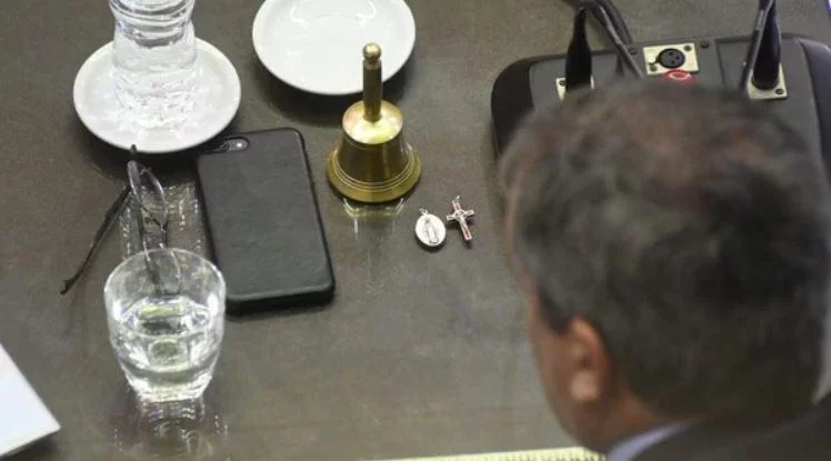 Durante la histórica sesión parlamentaria, un fotógrafo captó un detalle particular. El exintendente de Carlos Tejedor tiene una cruz y una medallita apoyadas en su mesa. Para muchos, estos símbolos religiosos significarían una tendencia contraria a la interrupción voluntaria del embarazo. Pero puertas adentro de Cambiemos, no lo terminan por confirmar.
