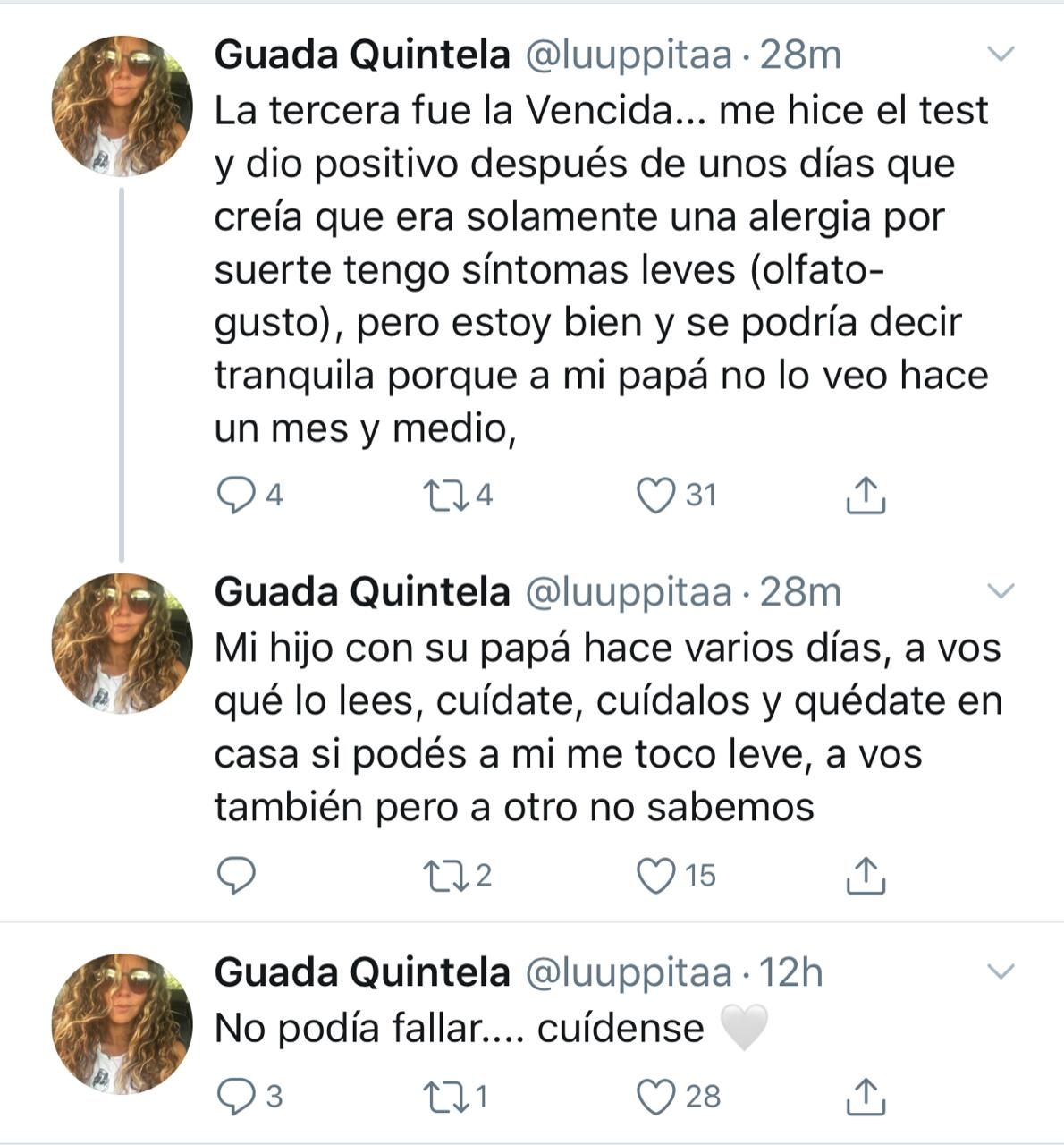 En su cuenta personal de Twitter, Guadalupe Quintela escribió “La tercera fue la vencida… me hice el test y dio positivo después de unos días que creía que era solamente una alergia por suerte tengo síntomas leves (olfato- gusto), pero estoy bien y se podría decir tranquila porque a mi papá no lo veo hace un mes y medio".