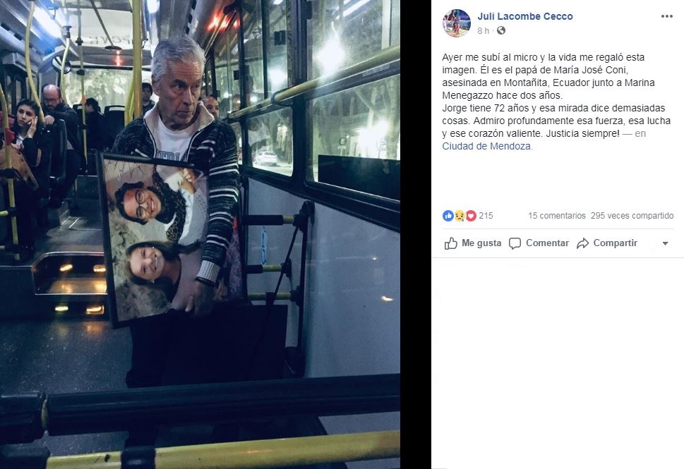 La lucha por justicia, por el asesinato de las jóvenes,comenzó a ser incansable para las dos familias. A casi tres años de aquel suceso, hoy las dos jóvenes volvieron a ser parte de una emotiva situación. “Ayer me subí al micro y la vida me regaló esta imagen. Él es el papá de María José Coni, asesinada en Montañita, Ecuador junto a Marina Menegazzo hace dos años”, escribió una joven mendocina.