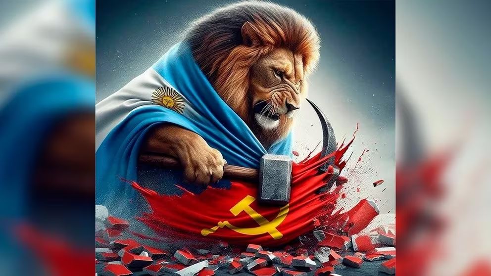 Lo que llamó la atención en las redes fue la imagen que el líder de La Libertad Avanza eligió para ilustrar su publicación virtual: la de un león (el felino con el que se caracterizó a Milei en su época de campaña proselitista) que martilla la insignia comunista. La potencia del golpe, sobre el símbolo de la hoz y el martillo, se graficó además con varios escombros en la base, producto del impacto.