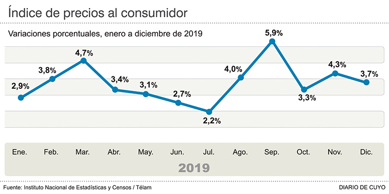 El Índice de Precios al consumidor aumentó 3,7% durante diciembre y acumuló una suba del 53,8% durante todo el 2019, la inflación más alta en 28 años, informó ayer el Instituto Nacional de Estadística y Censos (Indec).
