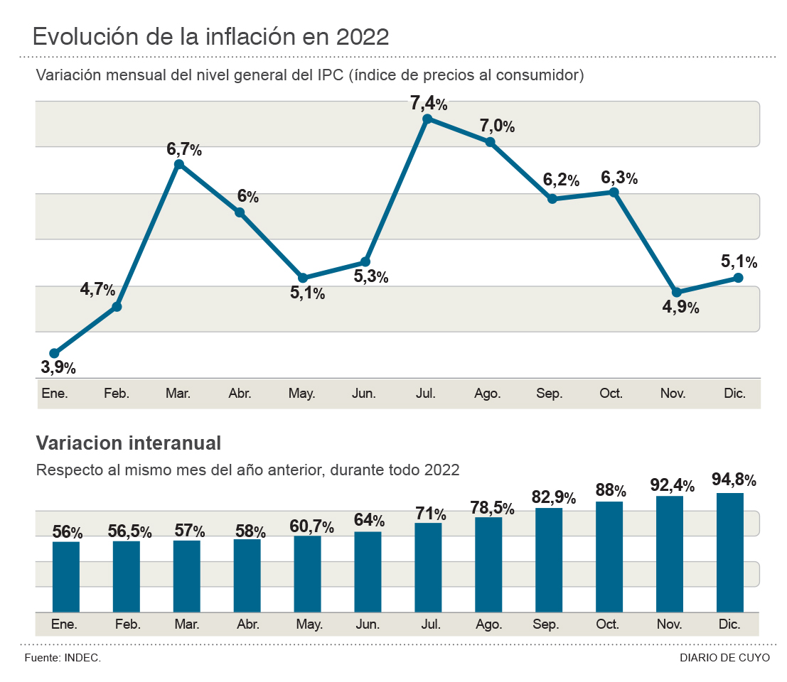También superó al 50,1 por ciento de 2021, según el INDEC. Pero el dato clave es que con este 5,1% arriba en diciembre, la inflación interanual de todo 2022 (comparado con todo 2021) alcanzó el 94,8%, el peor registro desde 1992, treinta años atrás, cuando en enero el acumulado anual había sido del 76%. Incluso es mayor, por lejos, que la inflación durante la presidencia de Mauricio Macri cuando en 2019 el valor interanual trepó a 57,3%.