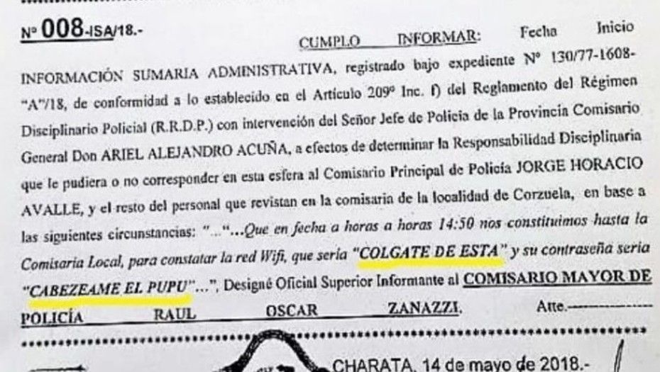 La red de la seccional de la localidad de Corzuela, cabecera del departamento General Belgrano, en el centro-oeste de la provincia, se llamaba "Colgate de esta". Y la contraseña para acceder, "Cabezeame el pupu" (sic).