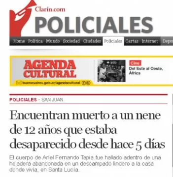 Los medios gráficos, televisivos y digitales del país se hicieron eco de la muerte del pequeño Ariel Tapia, encontrado ayer en un baldío.