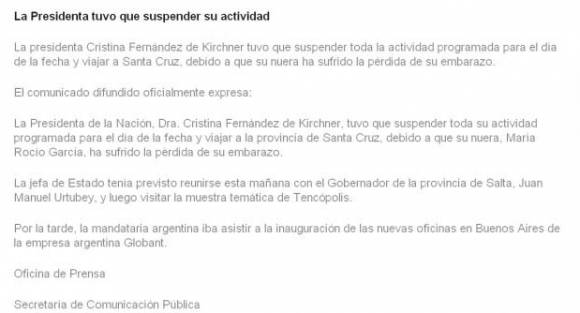 Buenos Aires, 11 de agosto.- La Presidente anunció que suspendió todas sus reuniones programadas en la agenda tras confirmarse la pérdida del embarazo de María Rocío García. La mandataria se traslada a la provincia de Santa Cruz para reunirse con sus familiares.