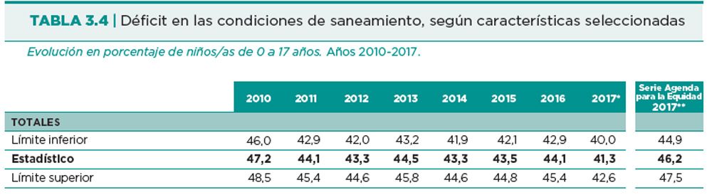 La problemática del saneamiento está fuertemente localizada en el GBA donde afecta al 63,7%. Sobre este punto Tuñon remarca que desde 2010 a la fecha hubo mejoras: en esa época afectaba al 47,2% a nivel nacional y el año pasado se ubicó en 41,3%. Sin embargo, recalca que habrá que estar atentos a cómo evoluciona este indicador pues la nueva política oficial de reducir más el déficit fiscal podría afectar a las obras.