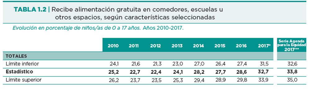 Ligado a este fenómeno se observa un déficit alimentario de 17,6% (chicos que no comieron correctamente) y 8,5% en su nivel más grave, es decir hambre. Además se detectó que de ese universo de niños un 33,8% asiste a comedores escolares, siendo nuevamente el GBA el espacio con mayor cobertura alimentaria directa con 37,7%.