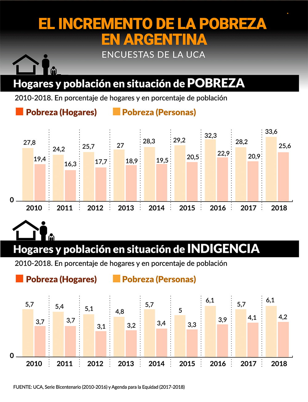 En el primer semestre de 2018, el INDEC arrojó el dato de que el 19,6% de los hogares en la Argentina está por debajo de la línea de pobreza, lo que comprende al 27,3% de las personas. Dentro de este conjunto se distingue un 3,8% de hogares indigentes que incluyen 4,9% de las personas.