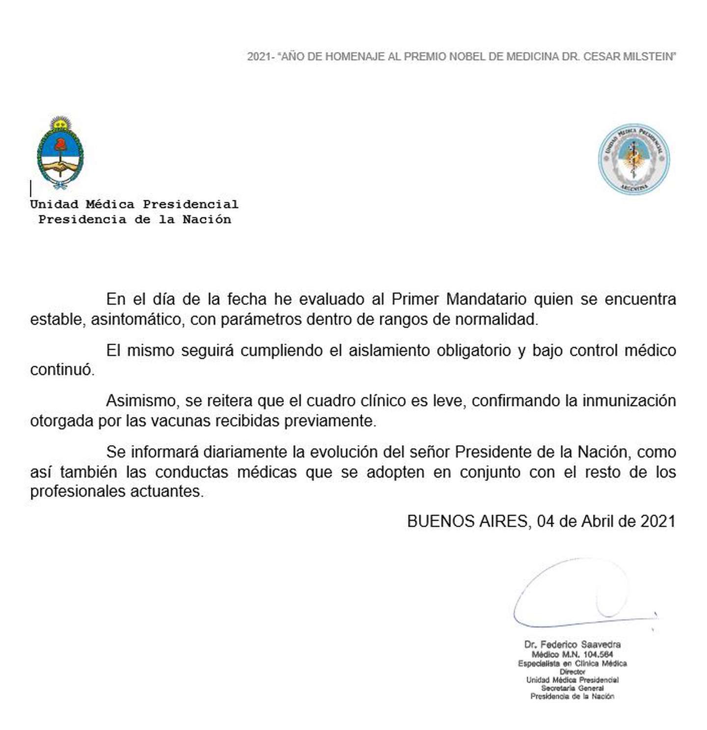 En la residencia de Olivos, el mandatario “seguirá cumpliendo el aislamiento obligatorio y bajo control médico continuo”. “Se informará diariamente la evolución del señor Presidente de la Nación, como así también las conductas médicas que se adopten en conjunto con el resto de los profesionales actuantes”, afirmó el parte dado a conocer este domingo.
