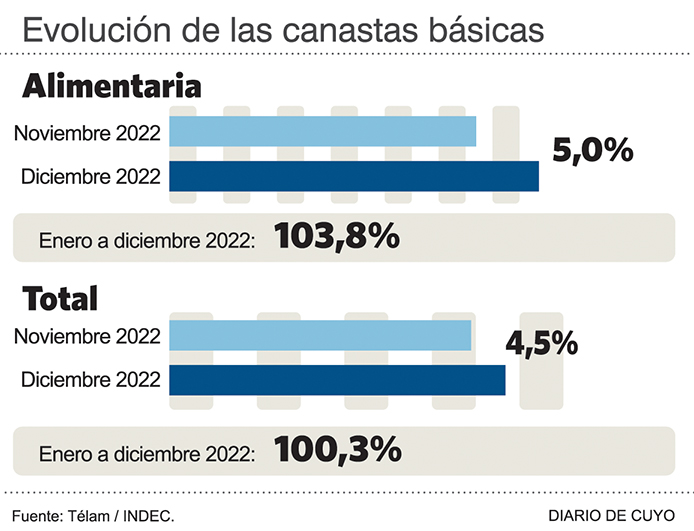 El Indec publicó ayer el dato que faltaba para completar el escenario que más inquietó al asalariado en Argentina durante 2022 y que amenaza con repetir en 2023: La Canasta Básica Alimentaria (CBA) -la que mide la indigencia- aumentó 103,8%, es decir que los alimentos de primera necesidad subieron por encima de la inflación general que cerró el año pasado con una marca del 94,8%. En tanto, la Canasta Básica Total (CBT) -que mide la pobreza- aumentó 100,3%.