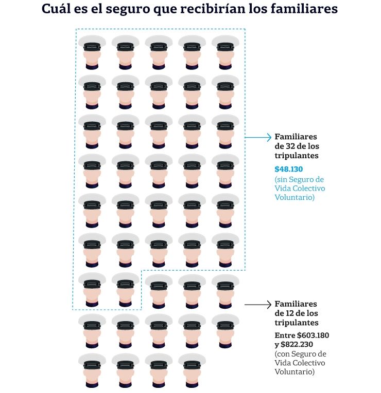 De los 44 tripulantes de la nave, 32 tenían las coberturas básicas, que implican un seguro de sepelio y un seguro social obligatorio. De manera que sus familias recibirán dos ítems: uno de $3800 y otro de $44.330. En total, suman $48.130.