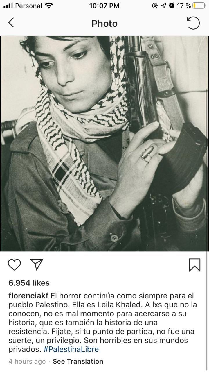 Florencia opinó en su cuenta de Instagram: "El horror continúa como siempre para el pueblo Palestino. Ella es Leila Khaled. A lxs (sic) que no la conocen, no es mal momento para acercarse a su historia, que es también la historia de una resistencia. Fijate si tu punto de partida no fue una suerte, un privilegio. Son horribles en sus mundos privados #PalestinaLibre".