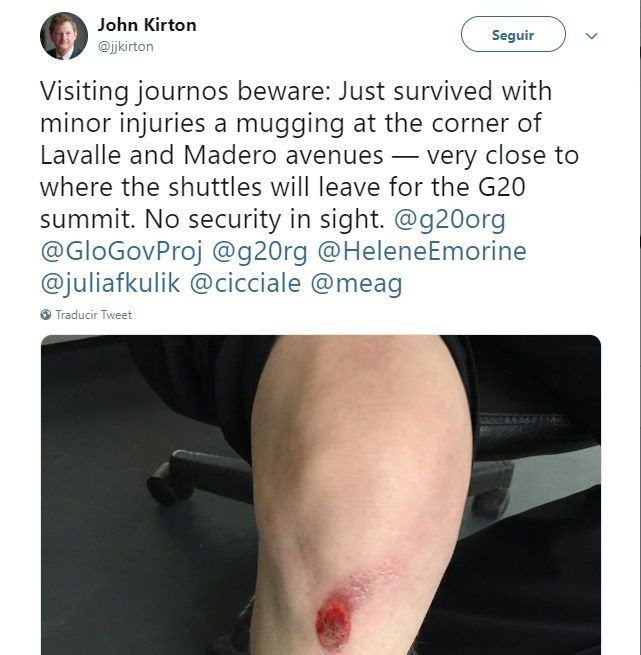 A lo largo de varias publicaciones, Kirton siguió proveyendo información sobre el hecho: "Estaba caminando con dos colegas que contraatacaron a los dos jóvenes que me atacaron a mi. Pero los visitantes que están en Buenos Aires por el G20 no deberían viajar solos ni confiar en la policía local para mantenerlos a salvo".