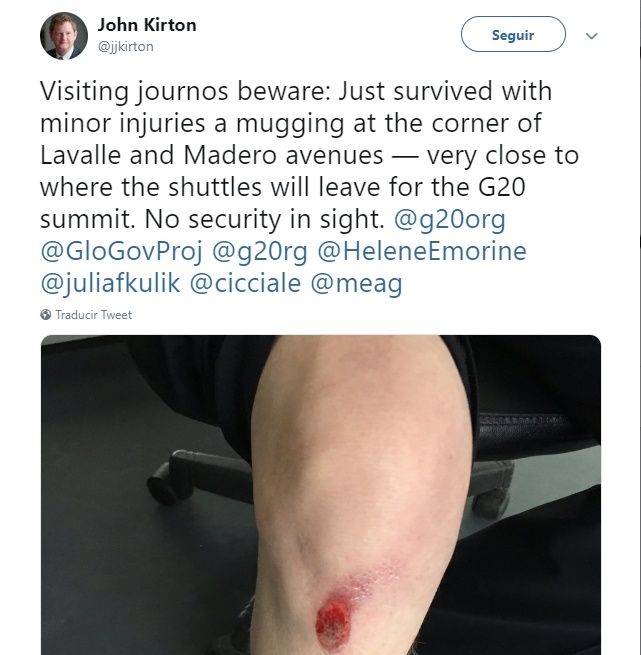 "Alerta visitantes: recién sobreviví con lesiones menores a un robo en la esquina de Lavalle y la avenida Madero. Muy cerca de donde se llevará a cabo el G20. No hay seguridad a la vista", twitteó el funcionario.