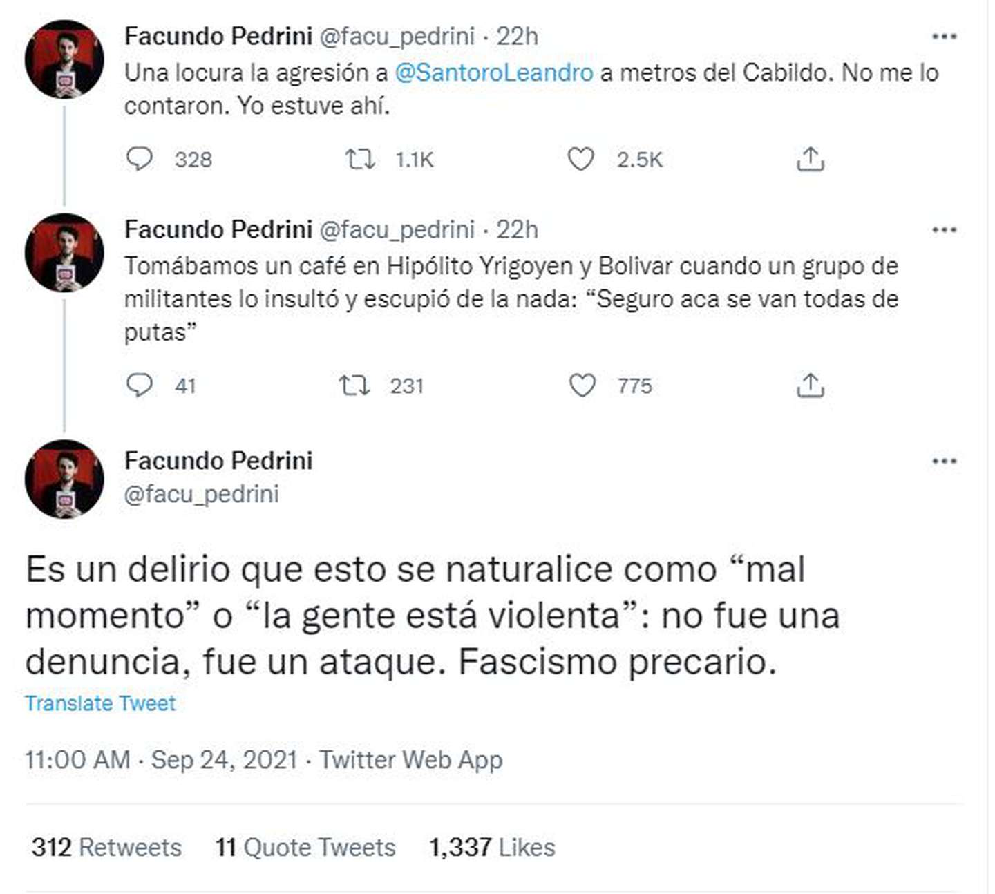 “Una locura la agresión a @SantoroLeandro a metros del Cabildo. No me lo contaron. Yo estuve ahí”, relató Pedrini, que después agregó que un grupo de militantes “lo insultó y escupió de la nada”. “Es un delirio que esto se naturalice como ‘mal momento’ o ‘la tenge está violenta’: no fue una denuncia, fue un ataque. Fascismo precario”, concluyó.