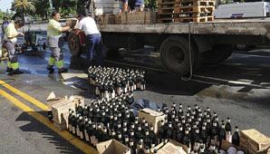 El camión transportaba 5000 botellas, muchas de las cuales se rompieron con el impacto y provocaron "charcos" de la bebida que los peatones de la zona deben esquivar.
