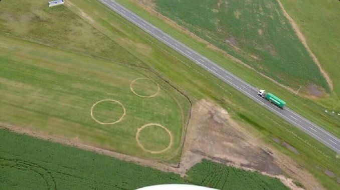 Por otro lado, con el pasar de las horas se fueron conociendo mayores detalles sobre la aparición. Se supo que primero apareció un círculo en la punta de la pista de aterrizaje. Y uno 10 días después se sumaron los otros dos.