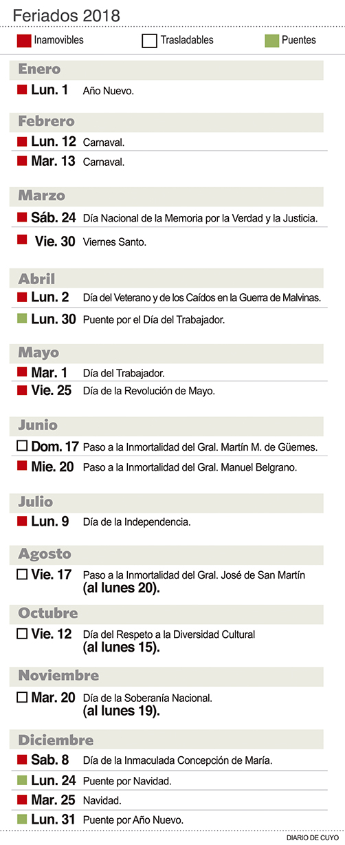 La nueva ley de feriados Nº 27.399, establece que durante 2018 habrá 12 feriados inamovibles que son el lunes 1 de enero; carnaval (12 y 13 de febrero); Semana Santa (del 29 de marzo al 2 de abril); viernes 25 de mayo; lunes 9 de julio; lunes 20 de agosto; lunes 15 de octubre; y lunes 19 de noviembre.