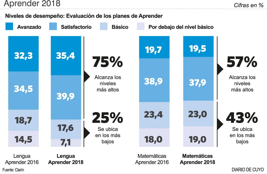 La evaluación determinó que casi ocho de cada diez alumnos de sexto grado alcanzaron los niveles más altos de rendimiento en Lengua en las pruebas Aprender que se tomaron el año pasado para conocer el nivel educativo, lo que representa una mejora de 8,5% respecto de 2016. En Matemáticas, en cambio, el 43% de los estudiantes (hace dos años eran 41%) no alcanza los niveles esperables para sexto grado: es decir, no puede resolver problemas que requieran identificar información no explícita o que involucren dos o más operaciones en los distintos conjuntos numéricos.