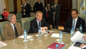 Buenos Aires, 28 de julio.-Los legisladores electos del Pro, Francisco De Narváez y Felipe Solá, quienes hoy se reunieron con el gobernador Daniel Scioli y su gabinete misterial, calificaron al encuentro de "correcto y positivo".Por su parte, Scioli destacó que la reunión fue "una muestra de madurez como la que está reclamando la sociedad".