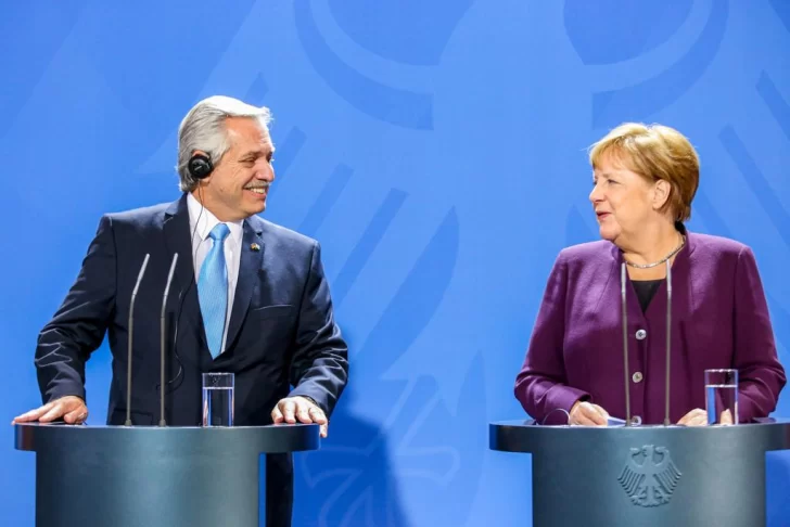 Angela Merkel y Alberto Fernández largaron una carcajada juntos apenas abandonaron los atriles donde dieron la declaración conjunta y salieron del alcance de las cámaras. Fue cuando ella le señaló a un fotógrafo ubicado en primera fila vestido con un traje que emulaba la camiseta de fútbol de Alemania.