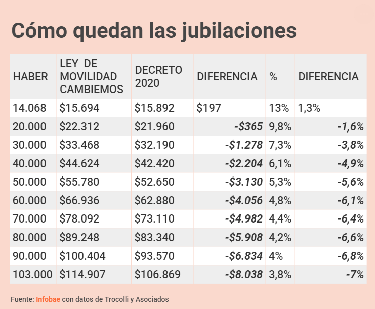 Para quienes ganan 30.000 pesos, el aumento, de $2.190, equivale al 7,3% y representa una pérdida de $1.278 pesos respecto del mecanismo anterior. Y las pérdidas respecto de aquel sistema aumentan para los jubilados con haberes superiores: $2.204 pesos menos para un jubilado con $40.000 de haber actual, $3.130 pesos menos para quien cobraba 50.000, y así siguiendo hasta una pérdida de $8.038 para un jubilado que cobraba el haber máximo de 103.000 pesos.